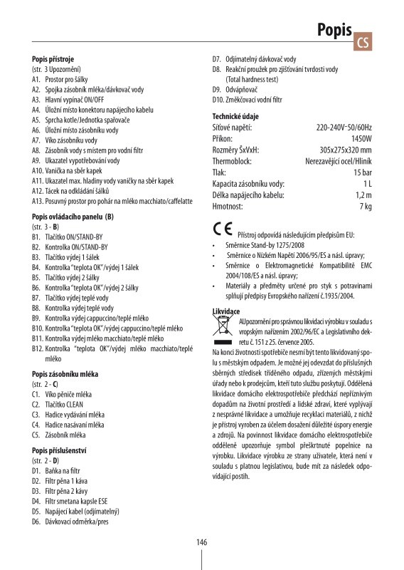 program odvápnění, by se měl po aktivaci vždy dokončit. Pokud se program přeruší z nějakého důvodu, bude Vám stále hlásit, aby jste program odvápnění provedl znovu. Pokud jste již provedl odvápnění odvápňovacím prostředkem a program se neukončil, tak a je potřeba program odvápnění znovu opakovat a tentokráte již bez odvápňovacího prostředku a nechte program dokončit. Doplňte vodu do 2/3 zásobníku vody a nechte běžet tak dlouho dokud se čerpadlo kávovaru nevypne!