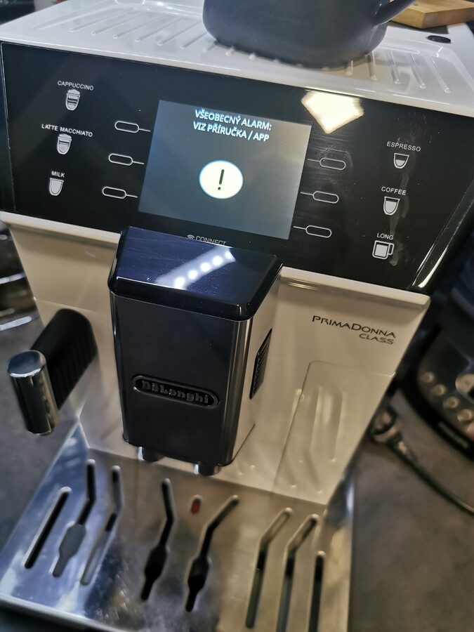 pokud kávovar opakovaně hlásí po zapnutí "všeobecný alarm", vyzkoušejte kávovar odpojit od sítě na dobu delší než 3 hodiny a následně zapněte. Pozorujte co kávovar dělá a podle toho si můžete vydedukovat možnou příčinu.