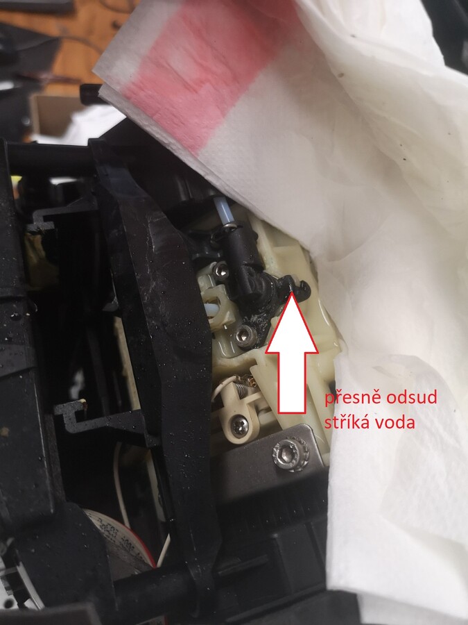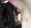 Nalezli jsme místo, kde kávovar stříká vodu - viz foto. Pravděpodobně je tedy buď špatné těsnění, nebo celá část (nevím jak se jmenuje).