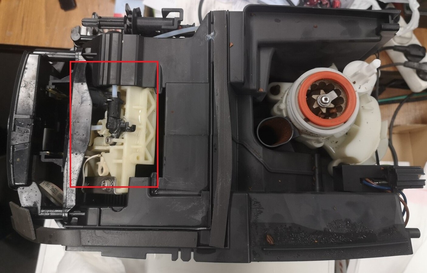 Pod kávovarem jsme nalézali hodně vody, takže nám bylo jasné, že někde voda protéká. Tak jsme se vrhli do dekonstrukce (kávovar již není v záruce).