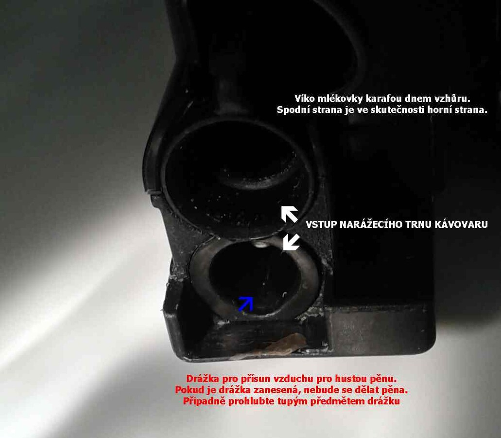 problém, proč nepění dostatečně mléko je, že směšovač (víko mlékovky) nemá dostatečné množství přiváděného vzduch pro napěnění. Jedné se o skulinku menší než špendlíková špička. Tato skulinka je v podobě drážky na víku mlékovky, kde z druhé strany těsní zelený kroužek narážecího trnu. Podobná skulinka je na regulátoru mléčné pěny, taky v podobě drážky a těsnění kolem této drážky může být poškozené tak, že zasahuje do drážky a ucpe ji.