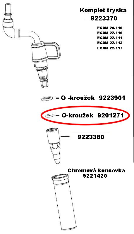 Zkontrolovat, zda parní tryska má všechna těsnění, viz obrázek