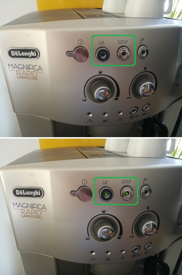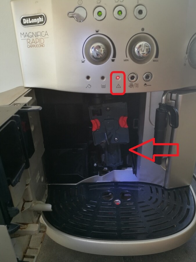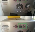 Dobrý den, po spuštění presovače blikají ikonky nahřívání vody, viz. obrázek č.1. Standardně je po cca 1-2 minutách presovač připravený, ikonky svítí. Nyní se ale po zhruba 6ti minutách rozsvítí červená Ikonka s vykřičníkem, spařovací jednotka je nahoře, při vypnutí a zapnutí presovače jen zhasnou/rozsvítí se všechny 3 ikonky (2 zelené, 1 červená) - viz. obrázek 2.