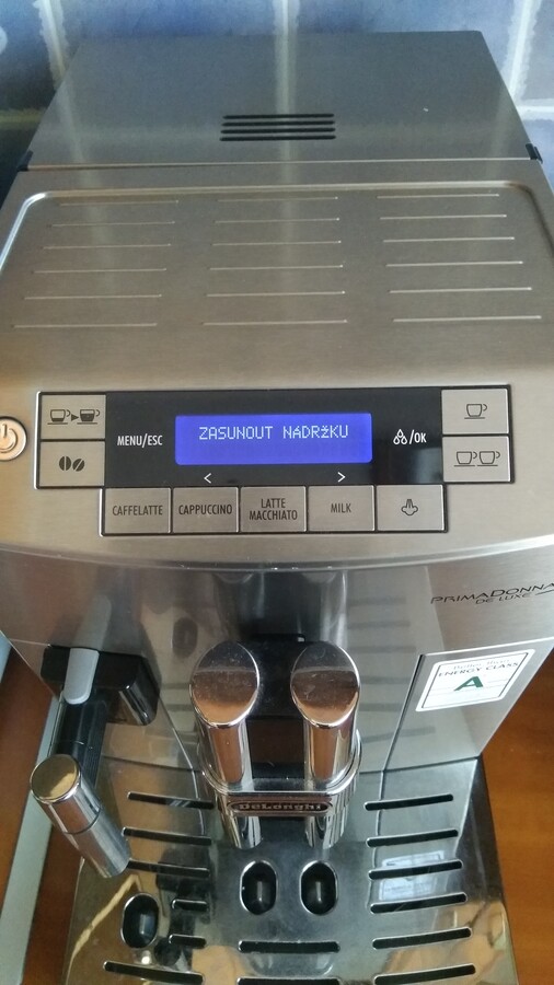 Dobrý den, svítí nápis jak je popsáno v původním příspěvku "ZASUNOUT NÁDRŽKU". Co se typu přístroje týče, možná jsem se spletl s číslicí na konci, mám k přístroji manuál ECAM 28.46X, kupován na začátku roku 2016 PRIMADONNA S DELUXE. Děkuji.