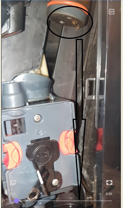 Kontrolou jsem zjistil, že voda uniká z pístu, který po ohřevu zajíždí do spařovací jednotky. K úniku vody z pístu však dochází pouze při prvotním spuštění kávovaru, a to během ohřevu vody viz přiložené foto.