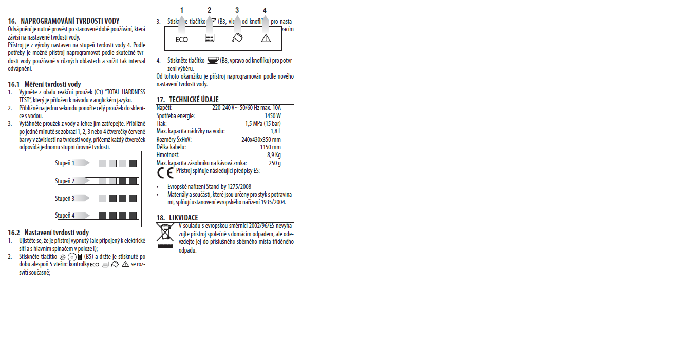 Zkoušel jsem změnit tvrdost vody ale podle návodu z internetu se mi to nepodařilo. V českém návodu ke kávovaru není o nastavení tvrdosti vody ani zmínka.