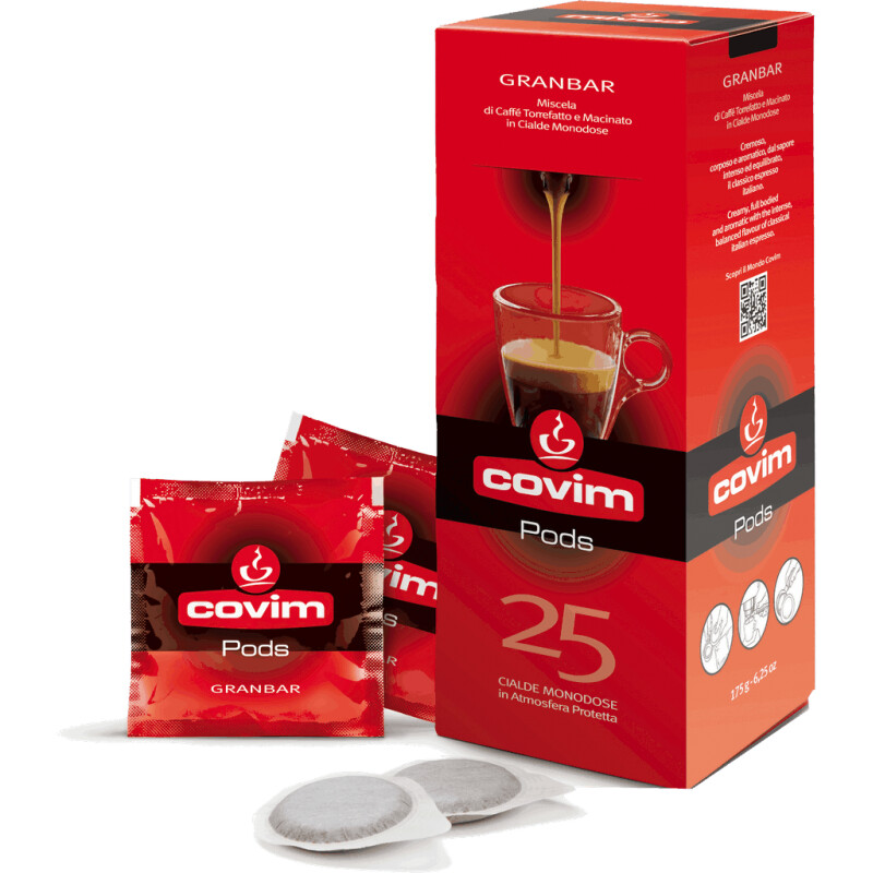 Italská káva Covim Granbar je porcovaná v tzv. E.S.E. tabletách. Covim Granbar představuje velmi oblíbenou směs kávy Arabica a výběrových káv odrůdy Robusta.
