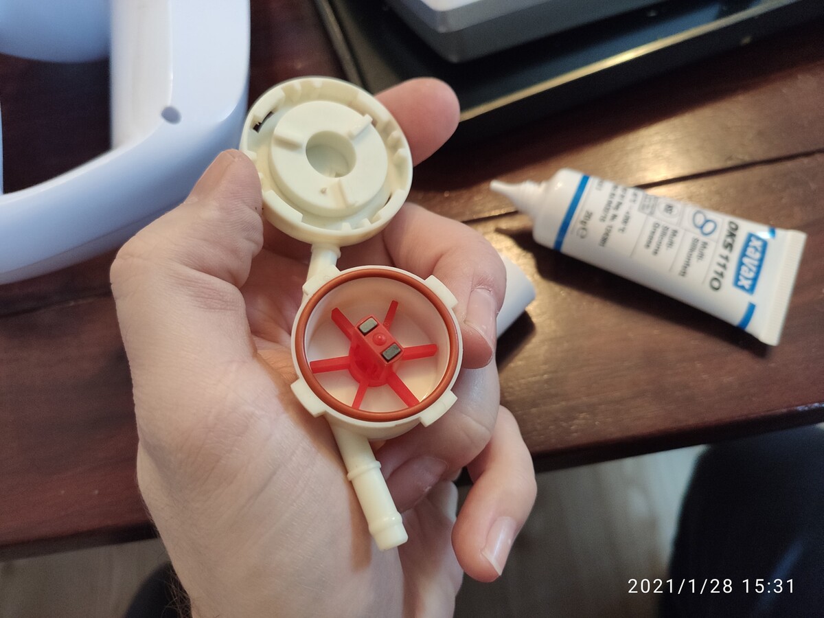 "Průtokoměr", tak se nazývá krabička s vrtulkou, kterou jste otevřel, jak "pandořinu skříňku", má za úkol hlídat správný objem v šálku a další průtoky vody příkladně na odvápnění. Hladinu vody hlídá snímač plováku v zásobníku na vodu, který s průtokoměrem nemá pranic společného.