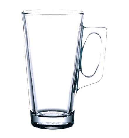 Sada čirých skleněných hrnků kónického tvaru na teplé nápoje.